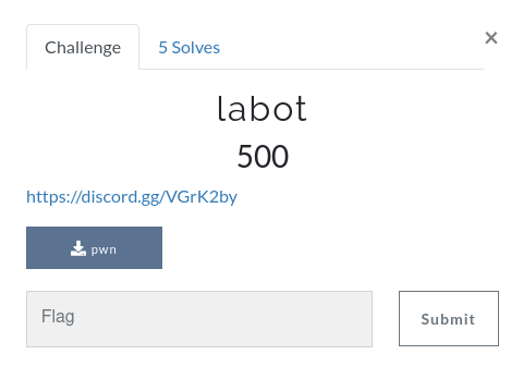 Este challenge fue un challenge de la categoría pwn, llamado labot. Su descripción es bien breve, nos da una dirección de discord (que sirve para invitar a un bot), y un respectivo binario.
