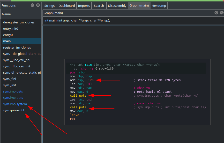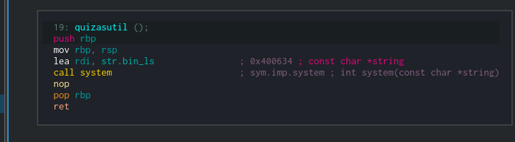 De aquí podemos ver que es un binario simple, que hace una llamada a gets, y luego saca por pantalla lo escrito con puts. siendo el stackframe de 128 bytes, (+ 8 bytes del saved rbp), teóricamente tendríamos el crash en 136 bytes. Otro detalle, es que tenemos una entrada en la PLT para system, esto debido a que tenemos una función llamada “quizasutil”, vendría útil al momento de explotar, no hace más que lanzar un /bin/ls