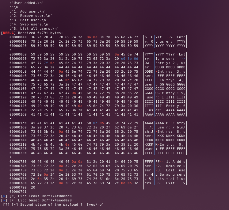 The main purpose of this binary is to create a very bad database written in C, allocating “names” for the entry of the db.
