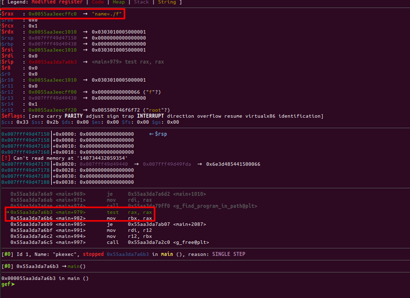 In order to trigger this from inside the code, lets create the name=. directory and lets see on the debugger what is written on the envp[0] while executing it with the PATH=name=.