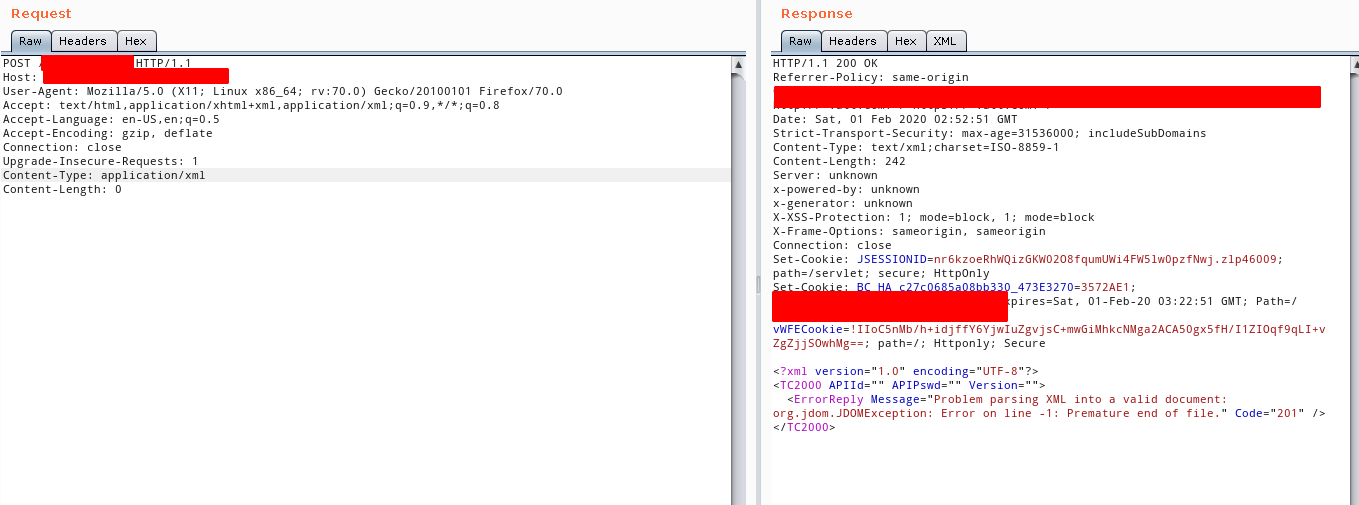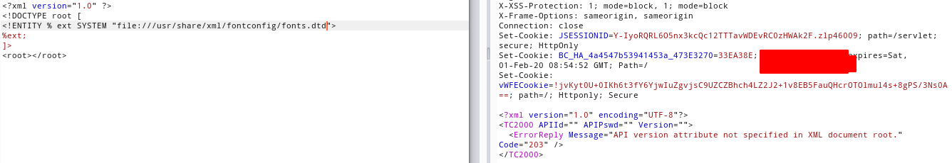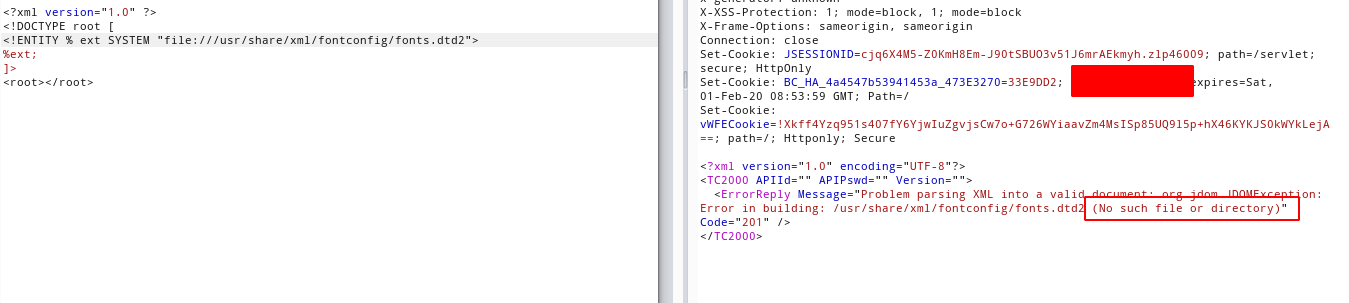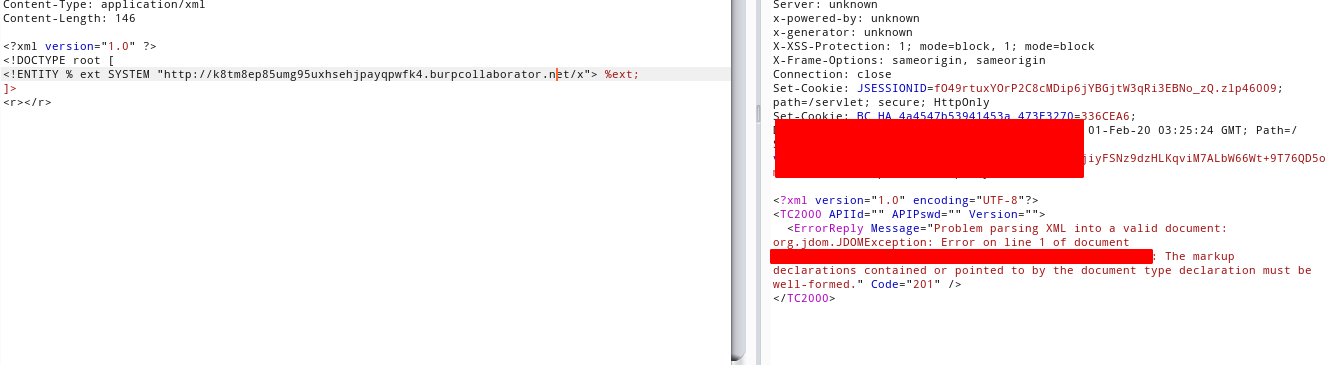 The first one was just to check if the DOCTYPE definition was enable, normally in java servlets applications, you can turn off the parse of customs DOCTYPE's if you want it, but this time (Luckily), it was enable, but just a DNS request came out of the company, not a HTTP Request., this allow me to think that a external entity attack can be exploited.