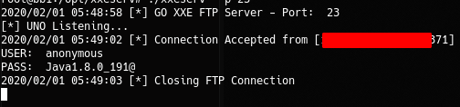 We can’t fetch anything external with HTTP requests, so my first aproach, was exfiltrate it via FTP, using the xxeserv in GO.